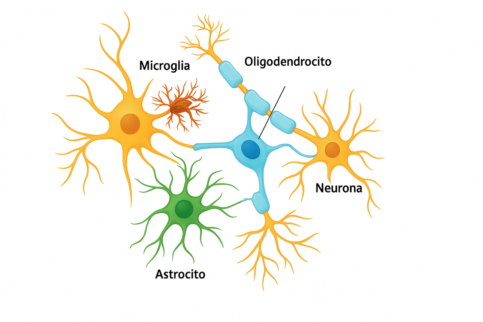 Para comprenderlo, primero debes conocer los dos tipos de células que constituyen el sistema nervioso: la neurona, su unidad especializada en el procesamiento y transmisión del impulso nervioso, y las células gliales o neuroglía (que se llaman astrocitos, oligodendrocitos y microglía), que realizan funciones de soporte y apoyo, entre las que se incluye la eliminación de desechos del metabolismo cerebral.