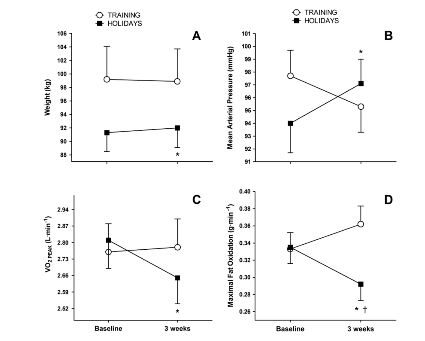 Por el contrario, los que suspendieron el ejercicio experimentaron un aumento de peso promedio de 0.67 kg, junto con un empeoramiento en su presión arterial, sensibilidad a la insulina y perfil lipídico (sobre todo por aumento de colesterol LDL).