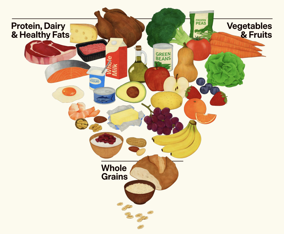 Las guías priorizan patrones dietéticos construidos alrededor de verduras, frutas, cereales integrales, proteínas de alta calidad (considerando dentro de esta clasificación fuentes animales y vegetales), lácteos y grasas consideradas saludables (incluyendo a su criterio en este grupo, alimentos altos en grasas saturadas como la mantequilla), acompañados de una reducción clara de azúcares añadidos, carbohidratos refinados, sal en exceso y alimentos “industriales”.
