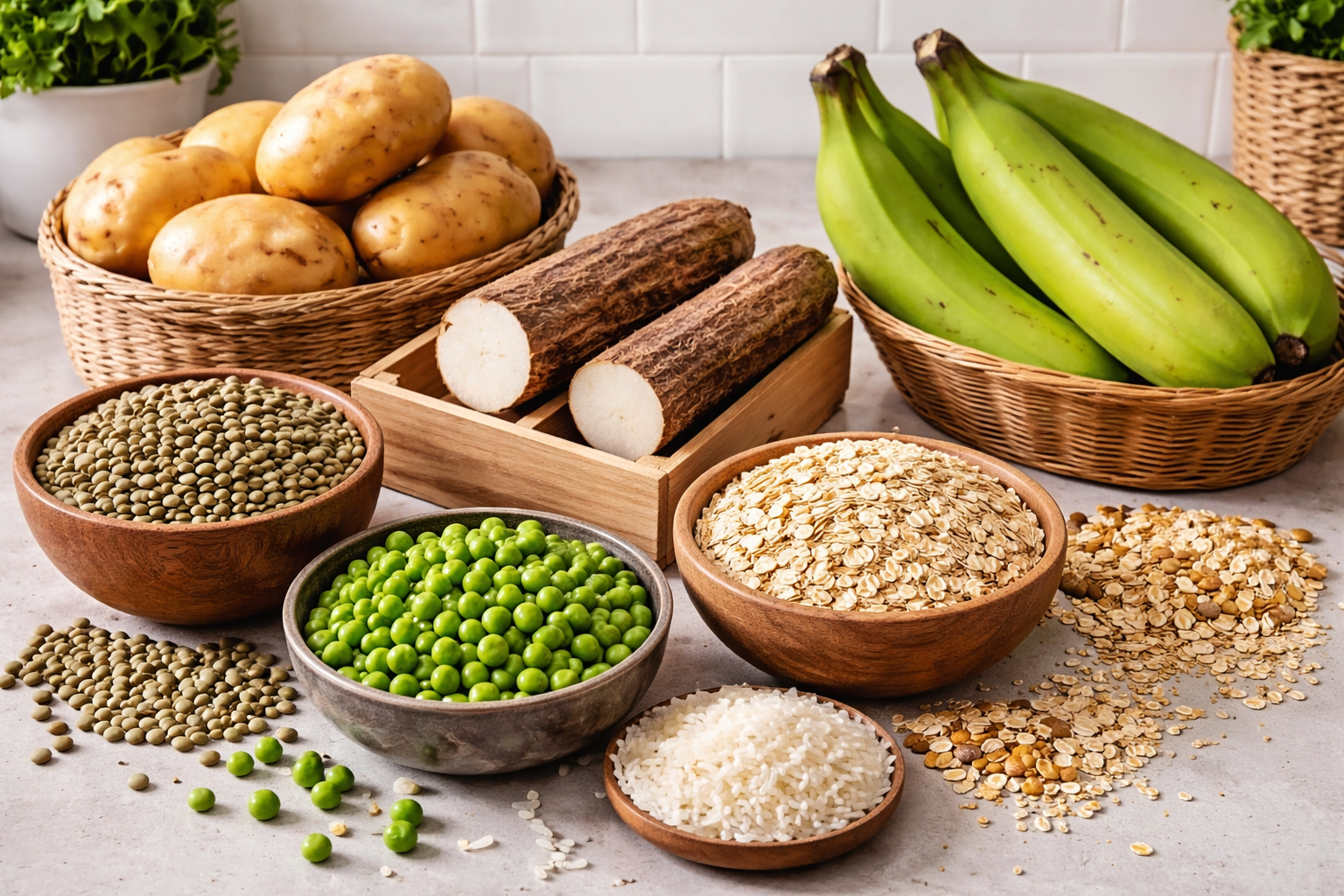 Las fuentes principales de almidón resistente son la patata y la yuca, el plátano verde o plátano macho, lentejas, guisantes y por último algunos cereales como arroz y avena. Siendo el rey de los alimentos con almidón resistente el almidón de la patata. Y por eso es altamente saciante y que te recomendamos como parte de una alimentación sana.