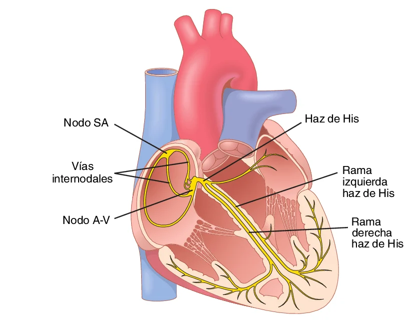 El nodo sinusal (o sinoauricular, en el dibujo “SA”) descarga de forma rítmica gracias a corrientes iónicas específicas (como la corriente "funny" If y las corrientes de calcio tipo T y L) que generan la despolarización (el inicio bioquímico de la contracción) automática.