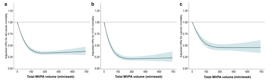 Ahora bien, el beneficio del ejercicio no es lineal, tiene forma de “curva en J”. Fíjate en la siguiente imagen, que muestra cómo disminuye la mortalidad total (a), por enfermedad cardiovascular (b) y cáncer (c) según la cantidad de ejercicio aeróbico de moderada intensidad a la semana.