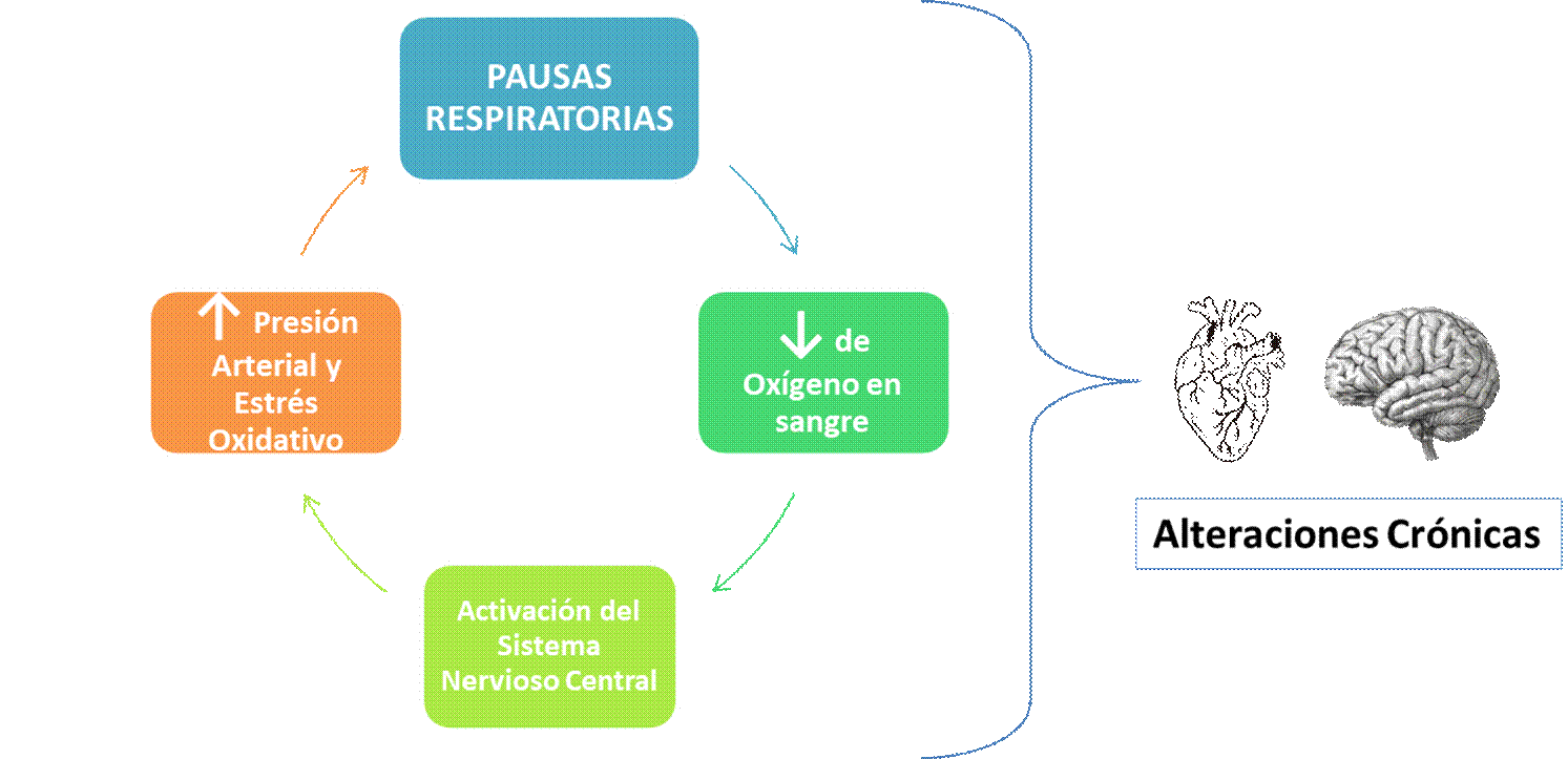 Todo esto genera un círculo vicioso, en el que las pausas respiratorias disminuyen el oxígeno en sangre y tu cuerpo responde activando el sistema nervioso simpático, aumentando la presión arterial de manera crónica y el estrés oxidativo a nivel global. Todo ello atenta contra nuestra salud cardiovascular: