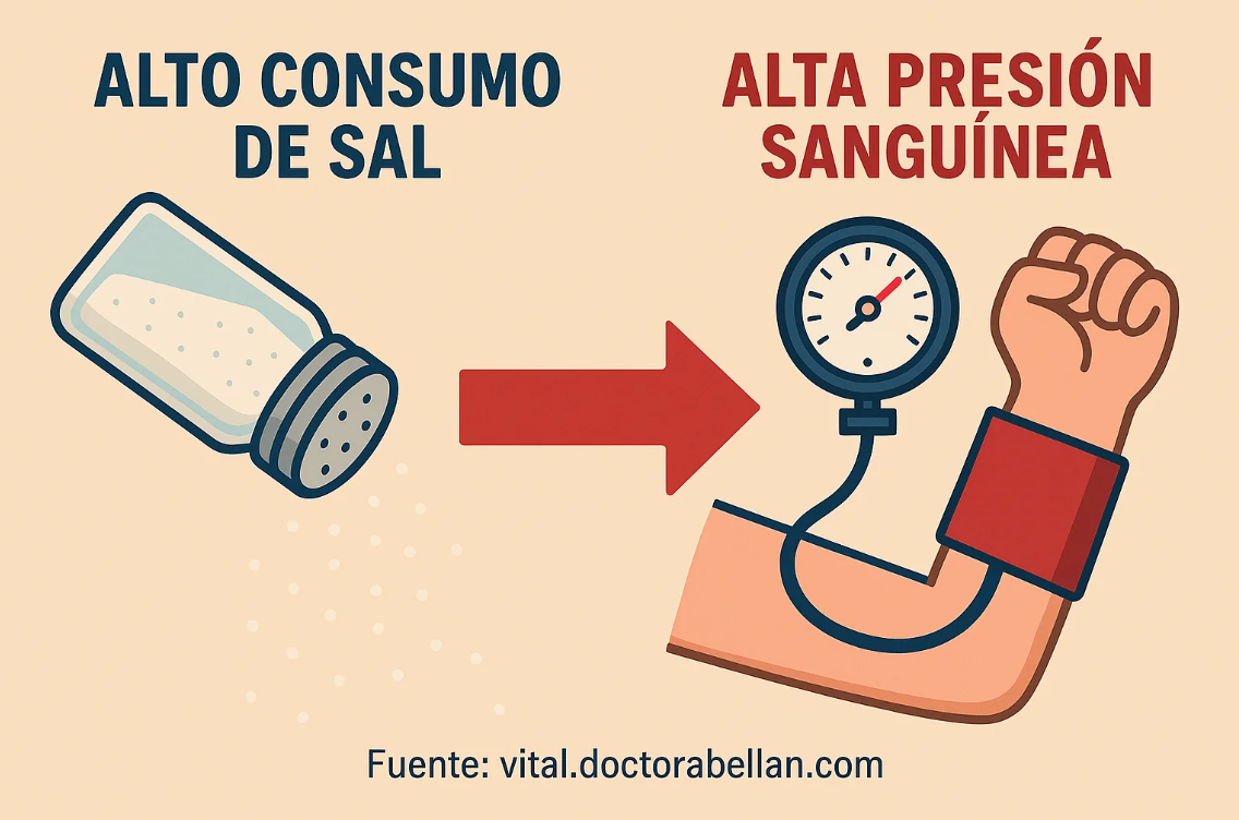 Es el sodio (el principal componente de la sal), el que juega un papel fundamental en el equilibrio de los líquidos en el cuerpo, y por tanto, en la regulación de la presión arterial. Su consumo se correlaciona de manera directa y dosis-dependiente con la presión arterial y el riesgo de enfermedades cardiovasculares.