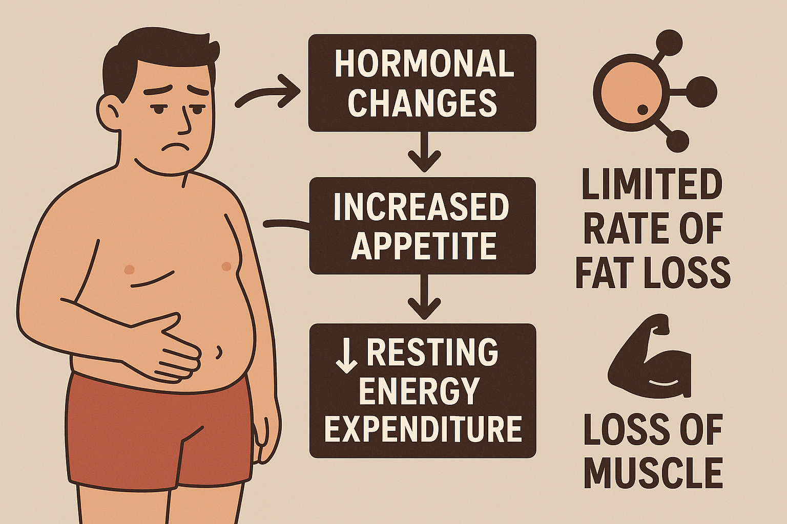 Tu cuerpo pone en marcha cambios hormonales, disminuye su gasto energético en reposo y en algunos casos, aumenta la sensación de apetito, todo ello para intentar evitar que no caigas en un déficit calórico sostenido. Y por si no fuera poco, incluso en condiciones controladas, la tasa máxima a la que la grasa corporal puede proporcionar energía es limitada, lo que significa que si fuerzas más, puedas acabar perdiendo músculo, algo que ya te digo yo, no te interesa.